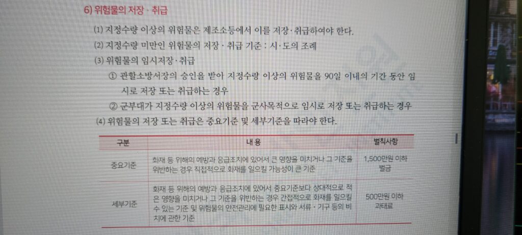 위험물의 저장·취급 기준은 지정수량 이상인지 미만인지에 따라 달라집니다. 본문에서는 위험물 저장소 기준, 임시저장 요건, 위반 시 벌칙(벌금·과태료)까지 정리했습니다. 소방안전관리자 시험과 실무 대비에 필수적인 내용입니다.